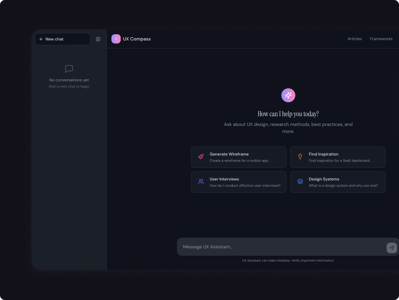 A UX Assistant web app designed to help new designers navigate their path into the industry with confidence. Built with Lovable, it provides guided support, practical insights, and structured direction.